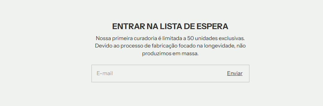 Os inscritos na Lista de Espera receberão um link de compra exclusivo por e-mail, 24 horas antes do lançamento oficial para o público geral. Isso garante a você a primeira escolha da curadoria.